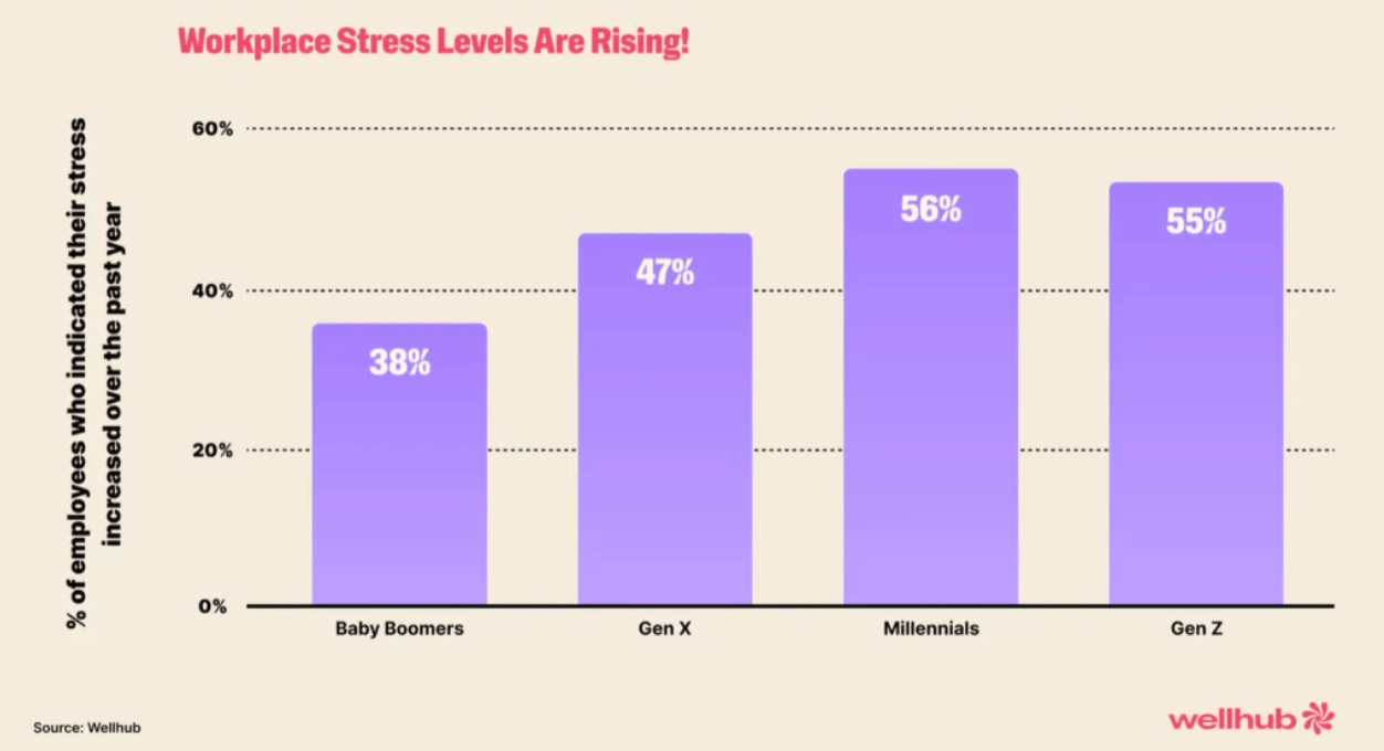 55% of Gen Z employees report rising stress levels, and 56% of Millennials are right there with us. Both groups are experiencing burnout symptoms several times a week. Fun times! 🙃
